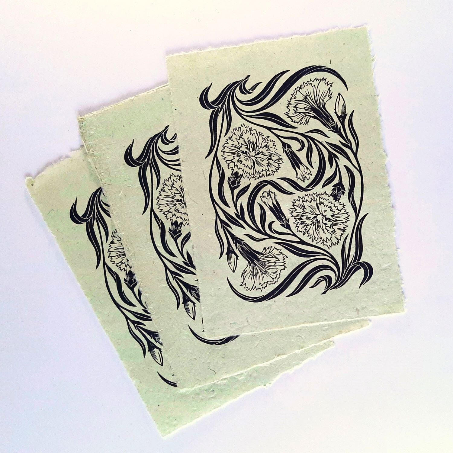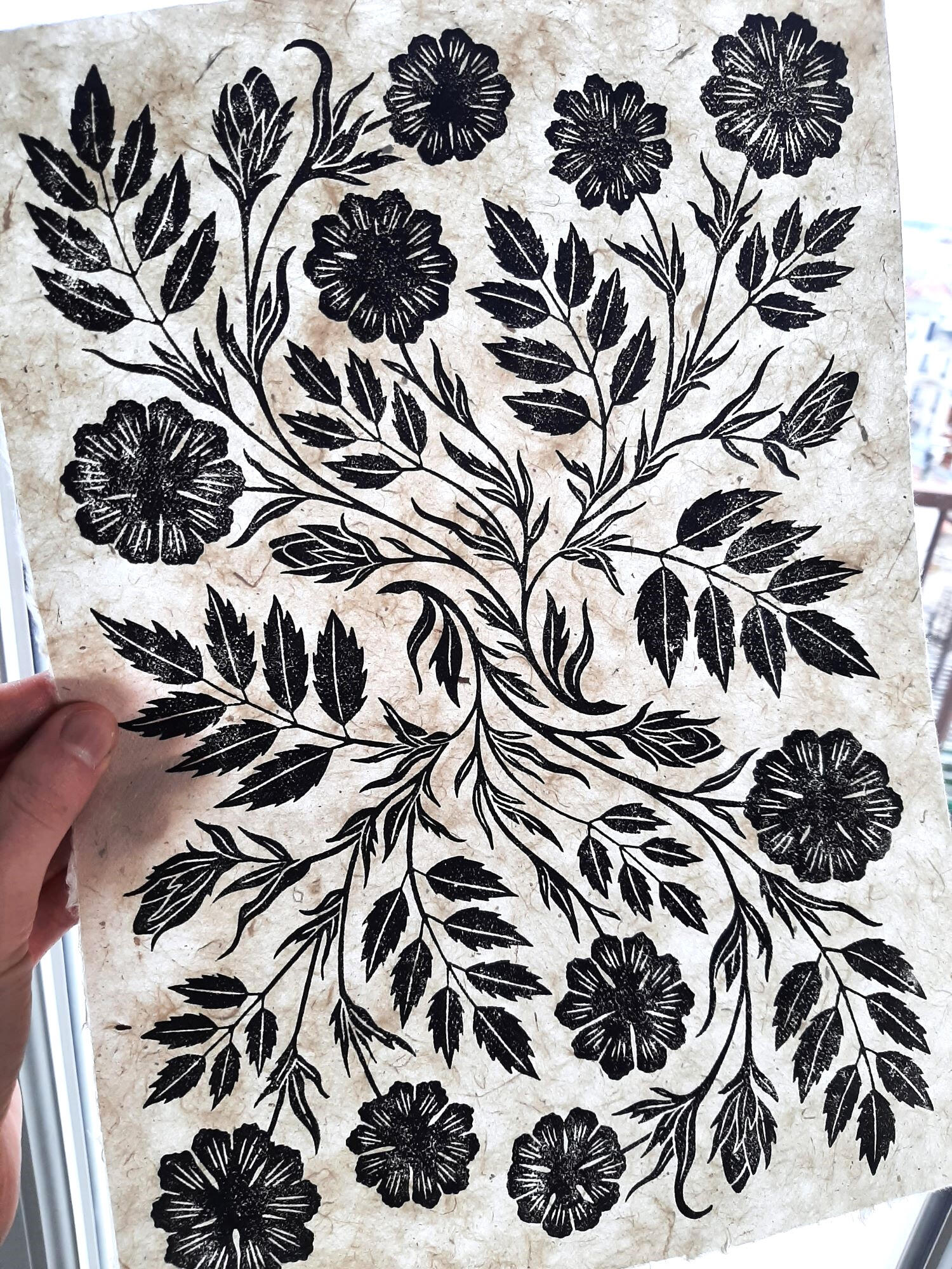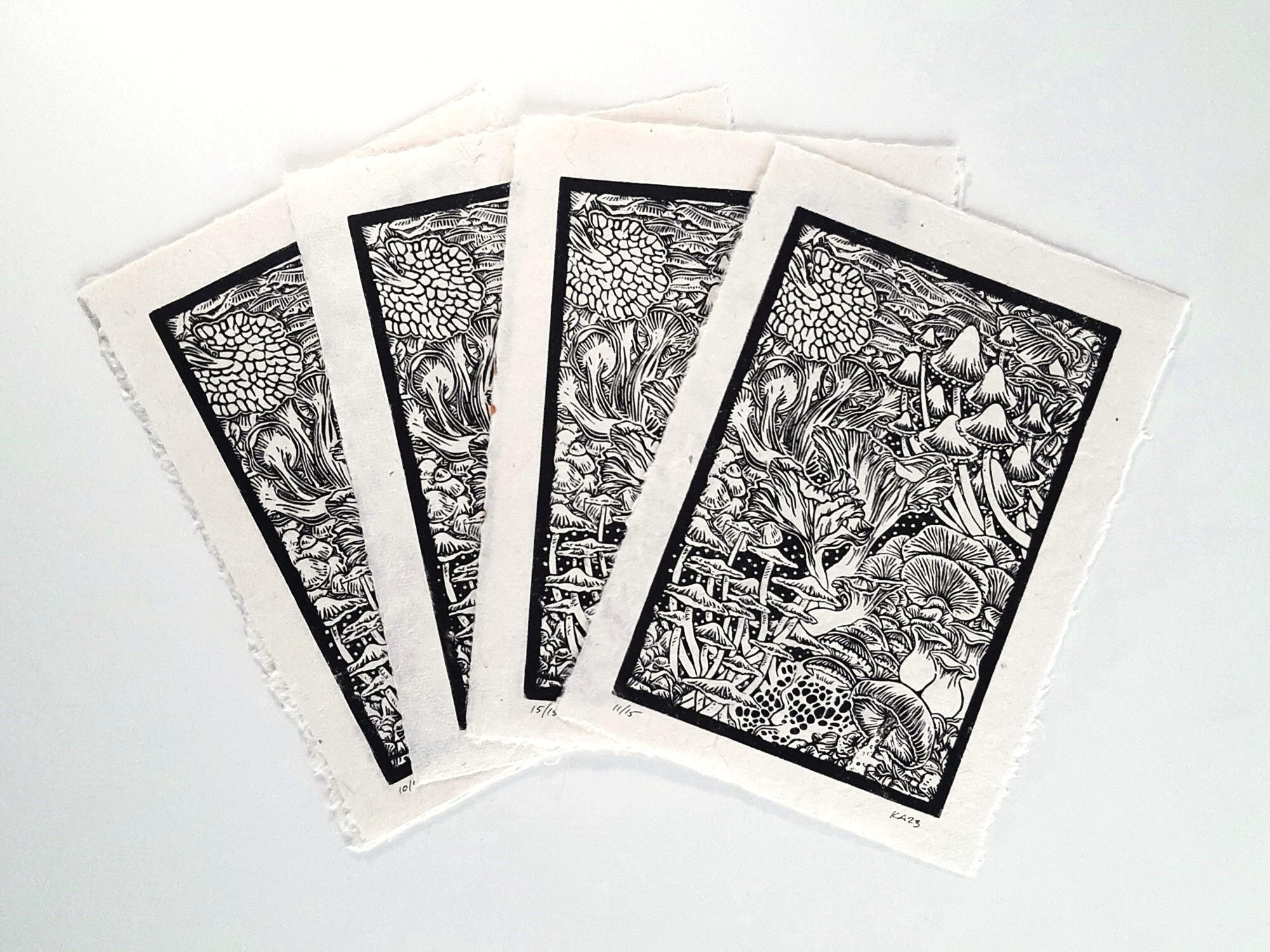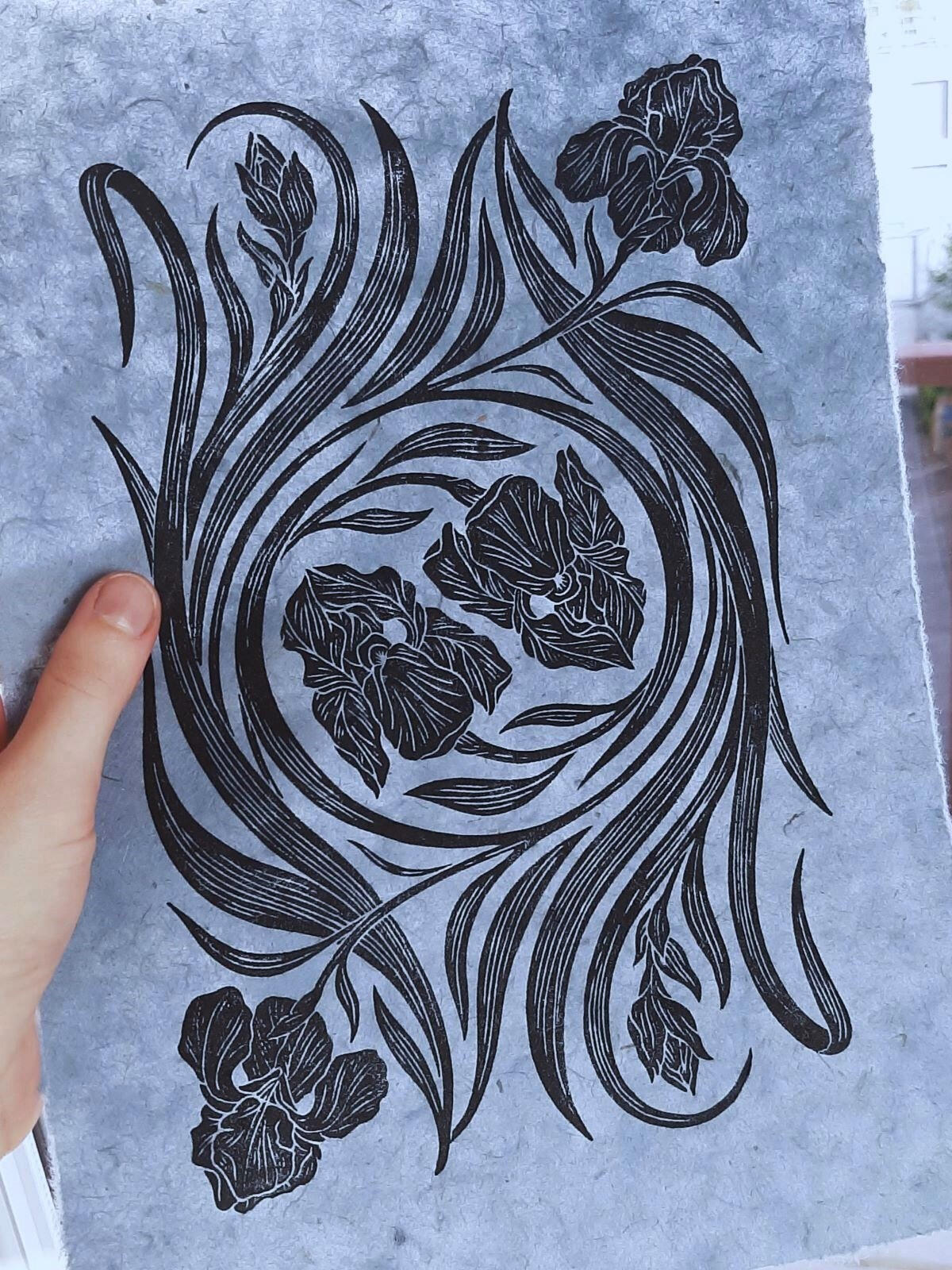 Katie, 31, illustrator and linocut printmaker based in Paris. Frequent subjects include floral and ornamental art, beasts and creatures, anatomy, and fanart. Not currently taking commissions but suggestions are always welcome!Katie, 31, est une artiste en linogravure basée à Paris. Ses sujets communs incluent l'art botanique et ornemental, les bêtes et les créatures, l'anatomie humaine et animale, et fanart/portraits/illustrations divers. Elle n'accepte pas actuellement les commissions, mais n'hésitez pas à faire des suggestions par email ou sur les réseaux !