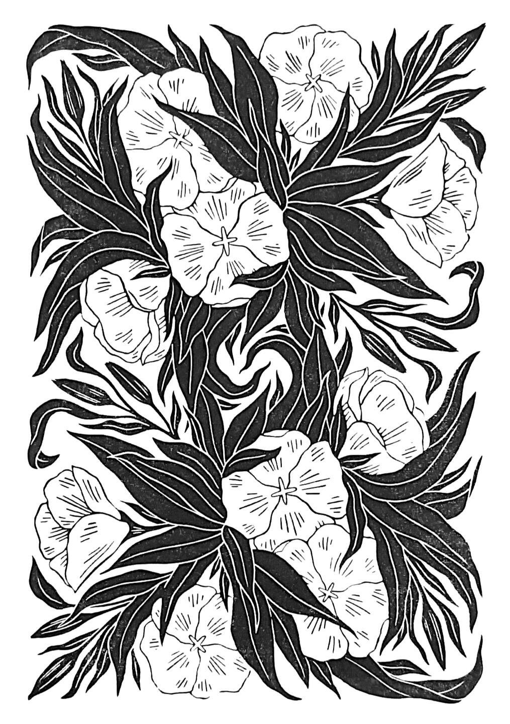 Katie, 31, illustrator and linocut printmaker based in Paris. Frequent subjects include floral and ornamental art, beasts and creatures, anatomy, and fanart. Not currently taking commissions but suggestions are always welcome!Katie, 31, est une artiste en linogravure basée à Paris. Ses sujets communs incluent l'art botanique et ornemental, les bêtes et créatures, l'anatomie humaine et animale, et fanart/illustrations divers. Elle n'accepte pas actuellement les commissions, mais n'hésitez pas à faire des suggestions !